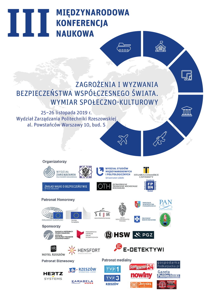 Wydział Zarządzania Politechniki Rzeszowskiej, Zakład Nauki o Bezpieczeństwie, Wydział Studiów Międzynarodowych i Politologicznych Uniwersytetu Łódzkiego, Ostbayerische Technische Hochschule Regensburg, Istanbul Commerce University, Państwowa Wyższa Szkoła Wschodnioeuropejska w Przemyślu, Fundacja Prowadzenia Badań Naukowych zapraszają na III Międzynarodową Konferencję Naukową „Zagrożenia i wyzwania bezpieczeństwa współczesnego świata. Wymiar społeczno-kulturowy”.