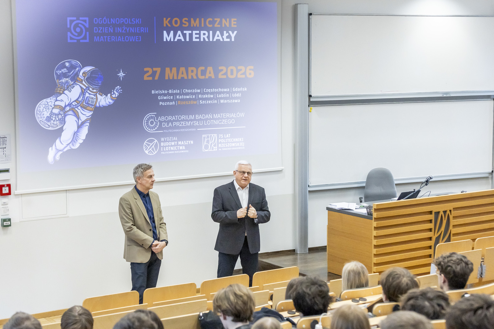 Uczestników wydarzenia przywitali dziekan Wydziału Budowy Maszyn i Lotnictwa dr hab. inż. Adam Marciniec, prof. PRz oraz przewodniczący Rady Dyscypliny Inżynieria Materiałowa dr hab. inż. Maciej Motyka, prof. PRz. Głównym punktem programu był wykład pt. Nie taka całkiem pusta przestrzeń – co grozi podróżnikom w kosmosie i jak ich chronić?”, który wygłosił dr hab. inż. Gaweł Żyła, prof. PRz. Podczas prelekcji uczestnicy poznali rzeczywiste zagrożenia występujące w przestrzeni kosmicznej, ze szczególnym uwzględnieniem promieniowania kosmicznego i jego wpływu na organizmy żywe. Omówiono podstawowe mechanizmy oddziaływania promieniowania jonizującego oraz czynniki decydujące o jego dawce, takie jak czas ekspozycji, odległość od źródła oraz zastosowana osłona.