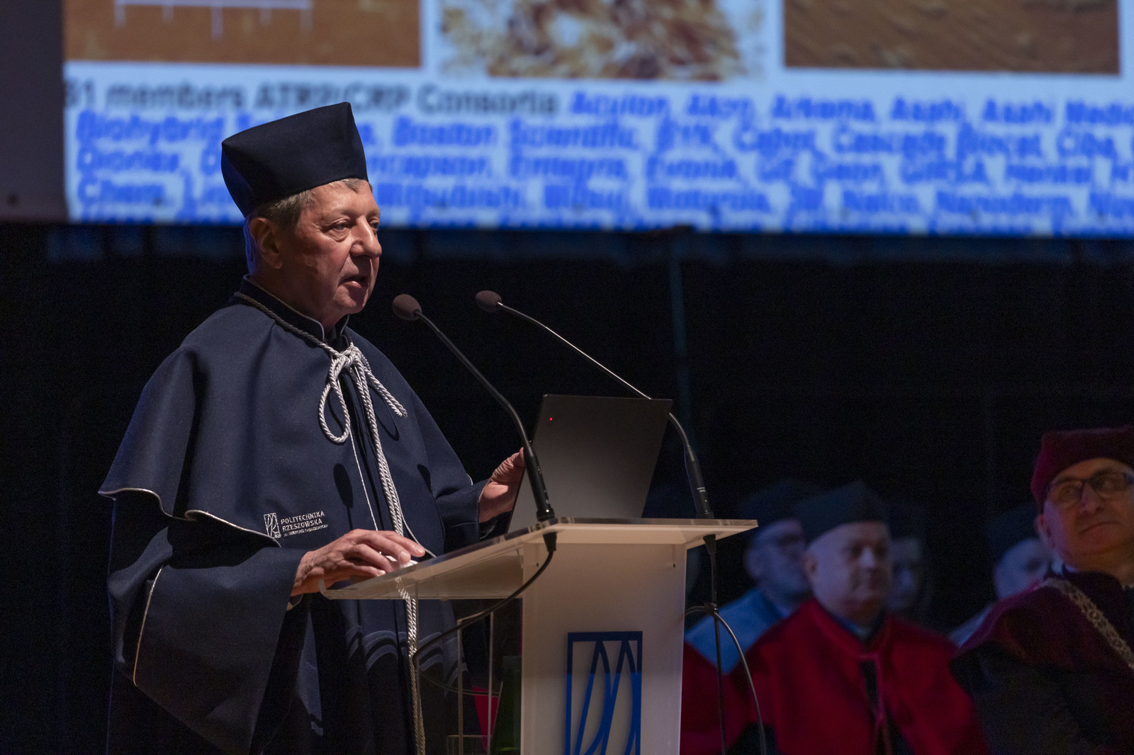 „Szczególnym zaszczytem jest przedstawienie sylwetki bohatera dzisiejszej uroczystości i jego niecodziennych dokonań, gdyż mam przy tym sposobność publicznie podziękować za wieloletnią współpracę, nadal owocującą wysokiej jakości pracami naukowymi, jak i za stworzenie możliwości prowadzenia badań w renomowanej zagranicznej jednostce naukowej w dziedzinie inżynierii makromolekularnej, co nadal jest głównym przedmiotem prowadzonych prac naukowych” – mówił prof. Paweł Chmielarz. Laudator przybliżył dokonania prof. Krzysztof Matyszajewskiego, które są wysoko cenione w międzynarodowym środowisku zarówno naukowców, jak i szeroko pojętego przemysłu, co obrazuje liczba przyznanych Profesorowi nagród, w tym otrzymanie tytułu doktora honoris causa dwóch polskich uczelni i 10 we Włoszech, Francji, w Belgii, Rosji, Grecji, Korei, Portugalii i Izraelu. O skali osiągnięć Profesora świadczy fakt, że według naukowego serwisu Thomson Reuters prof. Krzysztof Matyjaszewski jest typowany w ostatnich latach jako poważny kandydat do Nagrody Nobla w dziedzinie chemii. Prof. Paweł Chmielarz odniósł się również do współpracy Wydziału Chemicznego z prof. Matyszajewskim: „Wieloletnia współpraca Wydziału Chemicznego z naukowcem światowej sławy z pewnością wpłynęła pozytywnie na rozwój potencjału badawczego uczelni oraz stanowiła podstawy do stworzenia prężnie działającej grupy badawczej, którą kieruję, w zakresie dalszego rozwoju technik polimeryzacji rodnikowej z przeniesieniem atomu. Ponadto współpraca ta pozytywnie wpływa na wizerunek Politechniki Rzeszowskiej w aspekcie naukowym, zarówno na arenie krajowej, jak i międzynarodowej”.