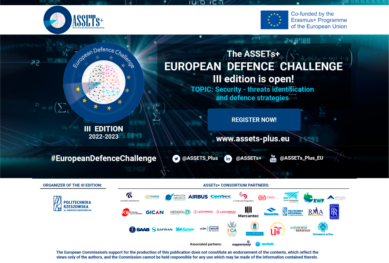 ASSETs+ European Defence Challenge (EDC) to otwarty konkurs mający na celu przyciągnięcie młodych talentów do przemysłu obronnego i zachęcenie ich do rozpoczęcia kariery w technologiach związanych z obronnością. Organizatorem tej edycji jest Politechnika Rzeszowska, a tematem przewodnim: „Security – threats identification and defence strategies".